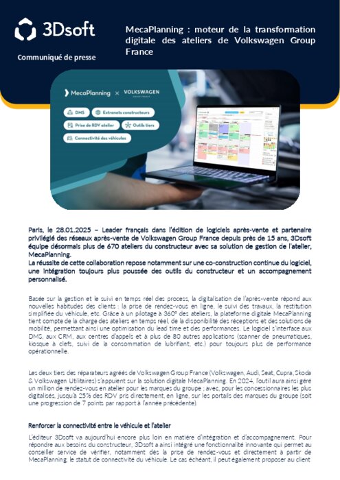 Leader français dans l’édition de logiciels après-vente et partenaire privilégié des réseaux après-vente de Volkswagen Group France depuis près de 15 ans, 3Dsoft équipe désormais plus de 670 ateliers du constructeur avec sa solution de gestion de l’atelier, MecaPlanning. La réussite de cette collaboration repose notamment sur une co-construction continue du logiciel, une intégration toujours plus poussée des outils du constructeur et un accompagnement