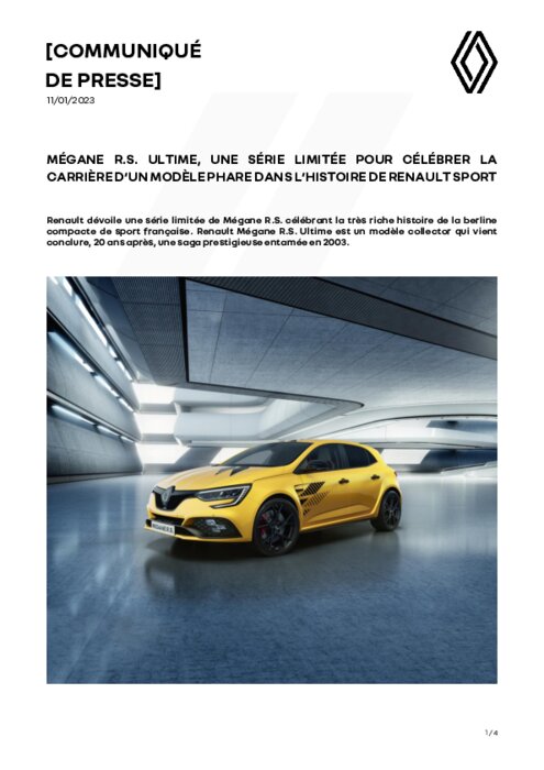 Constructeurs 11 janvier 2023 - 13:00 Renault dévoile une série limitée de Mégane R.S. célébrant la très riche histoire de la berline compacte de sport française. Renault Mégane R.S. Ultime est un modèle collector qui vient conclure, 20 ans après, une saga prestigieuse entamée en 2003. PDF (733 Ko) Télécharger