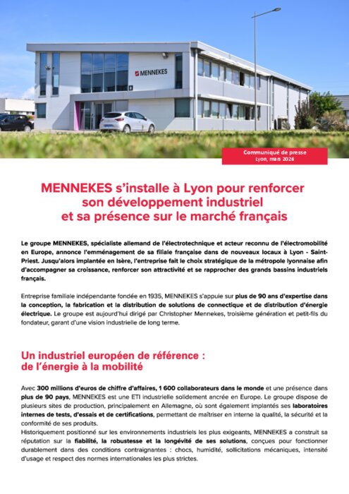 Le groupe Mennekes, spécialiste allemand de l'électrotechnique et acteur reconnu de l'électromobilité en Europe, annonce l'emménagement de sa filiale française dans de nouveaux locaux à Lyon - Saint-Priest. Jusqu'alors implantée en Isère, l'entreprise fait le choix stratégique de la métropole lyonnaise afin d'accompagner sa croissance, renforcer son attractivité et se rapprocher des grands bassins industriels français.