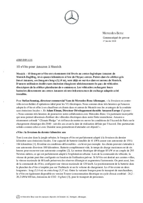 10 fourgons eVito ont récemment été livrés au centre logistique Amazon de Munich-Daglfing, sis à quatre kilomètres à l’est de l’hyper centre. Peints dans le célèbre gris foncé Amazon, ces fourgons longs (5,14 m), sont déjà en service dans et autour de Munich. D'autres utilitaires étoilés sans émission élargiront ultérieurement le parc de véhicules électriques de la célèbre plateforme de e-commerce. Les véhicules rechargent leurs batteries directement au centre Amazon...