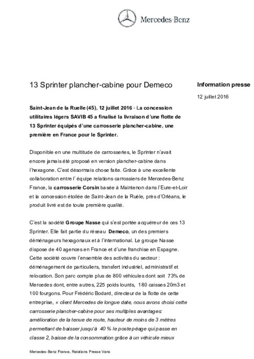 La concession utilitaires légers SAVIB 45 a finalisé la livraison d’une flotte de 13 Sprinter équipés d’une carrosserie plancher-cabine, une première en France pour le Sprinter. Disponible en une multitude de carrosseries, le Sprinter n’avait encore jamais été proposé en version plancher-cabine dans l’hexagone. C’est désormais chose faite. C’est la société Groupe Nasse qui s’est portée acquéreur de ces 13 Sprinter. Elle fait partie du réseau Demeco.