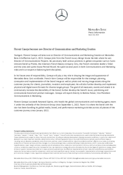 Florent Canepa prendra la direction de la communication et de la création marketing de Mercedes-Benz AG à compter du 1er avril 2023. Florent Canepa vient de la maison de luxe Hermès où il était directeur des projets de communication.
