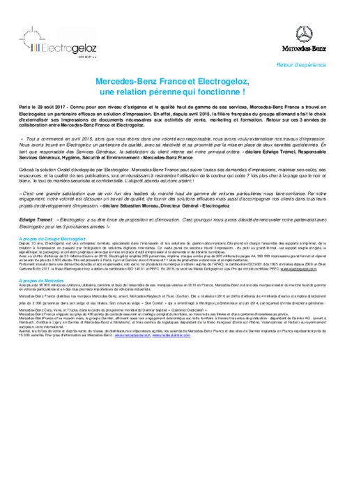 Connu pour son niveau d'exigence et la qualité haut de gamme de ses services, Mercedes-Benz France a trouvé en Electrogeloz un partenaire efficace en solution d'impression. En effet, depuis avril 2015, la filière française du groupe allemand a fait le choix d'externaliser ses impressions de documents nécessaires aux activités de vente, marketing et formation. Retour sur ces 3 années de collaboration entre Mercedes-Benz France et Electrogeloz.