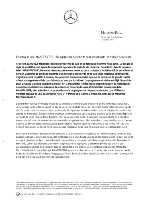 La marque Mercedes-Benz est synonyme de luxe et de fascination comme nulle autre. Le design, le style et les différentes lignes d'équipement expriment le style de vie personnel des clients. Avec le nouveau label "MANUFAKTUR", Mercedes-Benz répond encore mieux au désir croissant d'individualité de ses clients et enrichit la gamme de produits existante d'un surcroît d'exclusivité et de luxe : des matériaux sélectionnés, majoritairement travaillés à la main, des peintures exclusives...