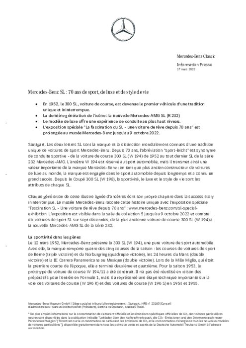Les deux lettres SL sont la marque et la distinction mondialement connues d'une tradition unique de voitures de sport Mercedes-Benz. Depuis 70 ans, l'abréviation "sport-leicht" est synonyme de conduite sportive - de la voiture de course 300 SL (W 194) de 1952 au tout dernier SL de la série 232 Mercedes-AMG. L'ancêtre W 194 est réservé au sport automobile, mais il transmet ainsi une valeur importante de la marque Mercedes-Benz : en tant que plus ancien constructeur de voitures de luxe au monde...