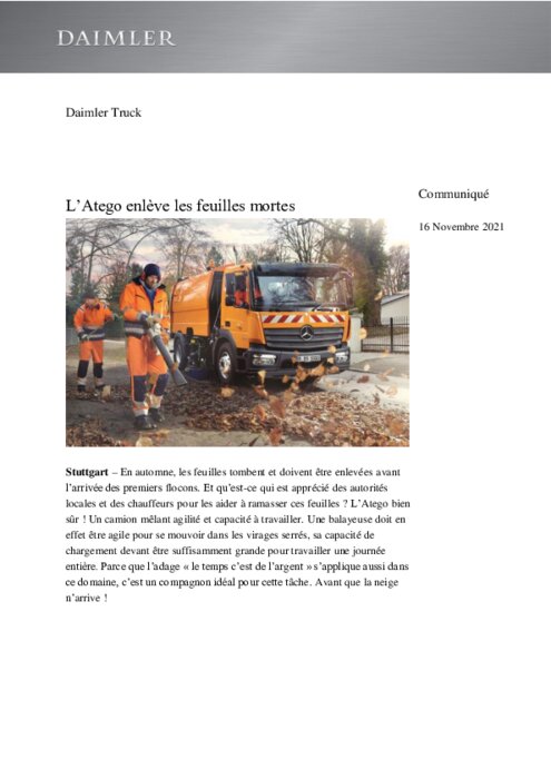 En automne, les feuilles tombent et doivent être enlevées avant l’arrivée des premiers flocons. Et qu’est-ce qui est apprécié des autorités locales et des chauffeurs pour les aider à ramasser ces feuilles ? L’Atego bien sûr ! Un camion mêlant agilité et capacité à travailler. Une balayeuse doit en effet être agile pour se mouvoir dans les virages serrés, sa capacité de chargement devant être suffisamment grande pour travailler une journée entière...