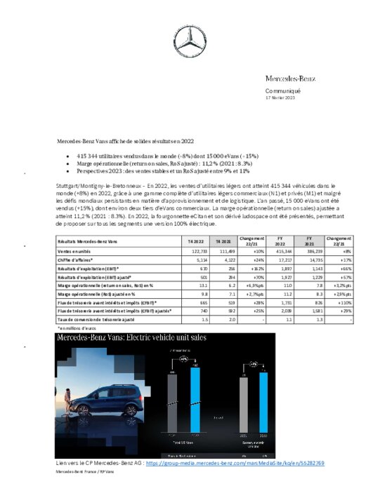 En 2022, les ventes d’utilitaires légers ont atteint 415 344 véhicules dans le monde (+8%) en 2022, grâce à une gamme complète d’utilitaires légers commerciaux (N1) et privés (M1) et malgré les défis mondiaux persistants en matière d’approvisionnement et de logistique. L’an passé, 15 000 eVans ont été vendus (+15%), dont environ deux tiers d’eVans commerciaux. La marge opérationnelle (return on sales) ajustée a atteint 11,2 % (2021 : 8.3%).