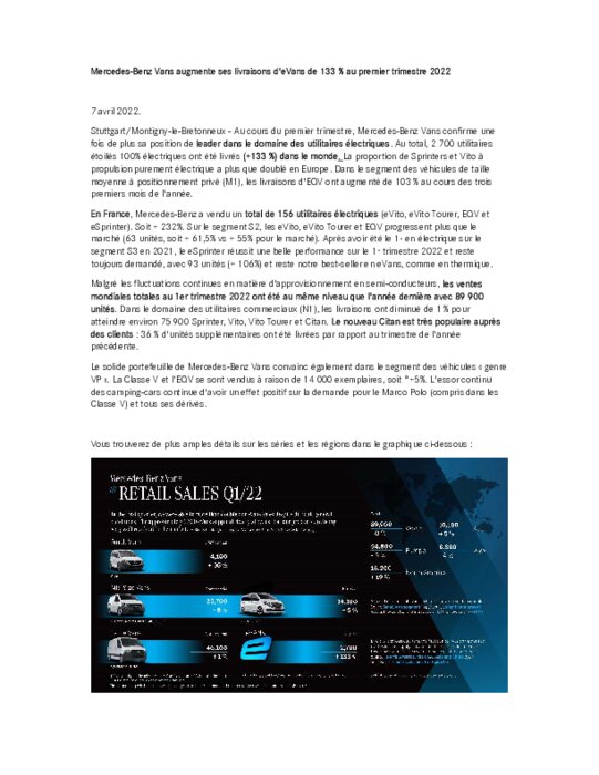 Au 1er trimestre, Mercedes-Benz Vans confirme une fois de plus sa position de leader dans le domaine des fourgons électriques. Au total, 2 700 fourgons alimentés par batterie de la marque à l'étoile à 3 branches ont été remis aux clients (+133%). La proportion de Sprinters et Vito à propulsion électrique a plus que doublé en Europe. Dans le segment des fourgonnettes de taille moyenne à positionnement privé, les livraisons d'EQV ont augmenté de 103% au cours des trois 3 premiers de l'année...