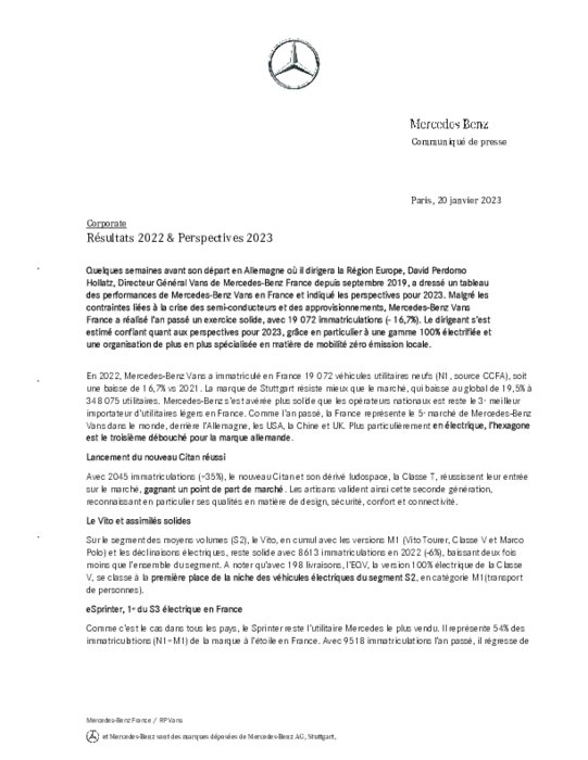 Quelques semaines avant son départ en Allemagne où il dirigera la Région Europe, David Perdomo Hollatz, Directeur Général Vans de Mercedes-Benz France depuis septembre 2019, a dressé un tableau des performances de Mercedes-Benz Vans en France et indiqué les perspectives pour 2023. Malgré les contraintes liées à la crise des semi-conducteurs et des approvisionnements, Mercedes-Benz Vans France a réalisé l’an passé un exercice solide, avec 19 072 immatriculations (- 16,7%).