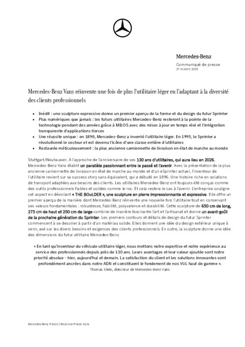 À l'approche de l'anniversaire de ses 130 ans d’utilitaires, qui aura lieu en 2026, Mercedes-Benz Vans établit un parallèle passionnant entre le passé et l'avenir. Avec la présentation de la plus ancienne camionnette de livraison en état de marche au monde et d'un eSprinter actuel, l'inventeur de l’utilitaire revient sur sa success story sans équivalent, qui a débuté en 1896.