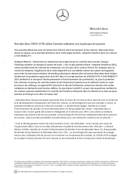 Mercedes-Benz intègre dorénavant les premières approches de la BCI dans le concept pionnier du VISION AVTR. A l’IAA MOBILITY 2021 de Munich, la marque à l’étoile présentera le fonctionnement du système BCI, et, pour la première fois, donnera un aperçu du contrôle mental et de l’interaction humaine avec le véhicule. Après un court processus de calibrage, un appareil BCI attaché à la tête de l’utilisateur, analyse les mesures des ondes cérébrales et déclenche une fonction définie...