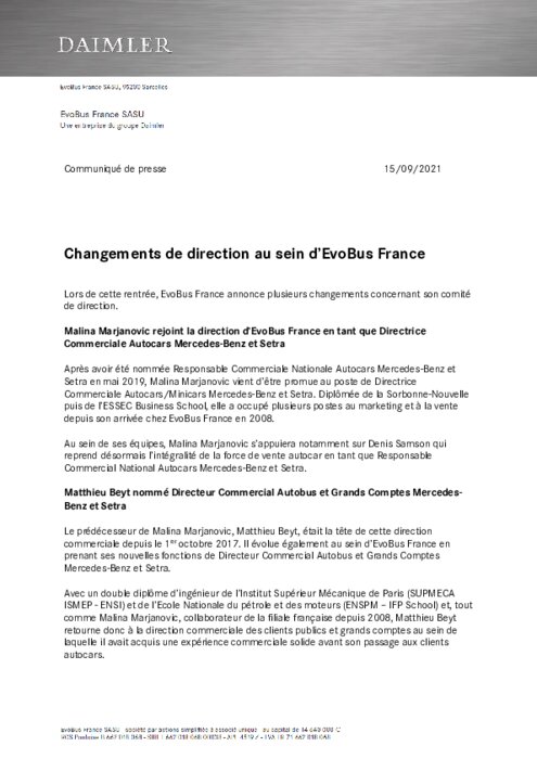 Constructeurs 16 septembre 2021 - 09:23 Lors de cette rentrée, EvoBus France annonce plusieurs changements concernant son comité de direction. PDF (311 Ko) Télécharger