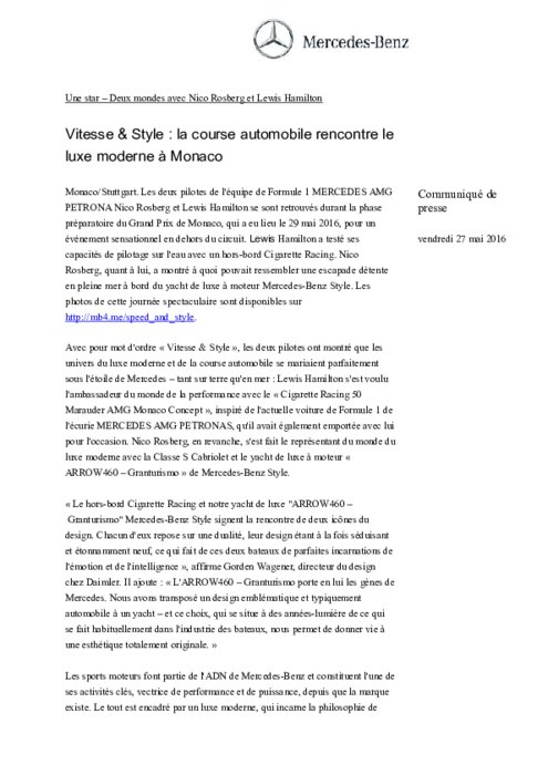 Les deux pilotes de l'équipe de Formule 1 MERCEDES AMG PETRONA Nico Rosberg et Lewis Hamilton se sont retrouvés durant la phase préparatoire du Grand Prix de Monaco, qui a eu lieu le 29 mai 2016, pour un événement sensationnel en dehors du circuit. Lewis Hamilton a testé ses capacités de pilotage sur l'eau avec un hors-bord Cigarette Racing. Nico Rosberg, quant à lui, a montré à quoi pouvait ressembler une escapade détente en pleine mer à bord du yacht de luxe à moteur Mercedes-Benz Style.