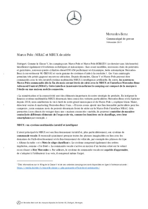 Comme la Classe V, les camping-cars Marco Polo et Marco Polo HORIZON (ce dernier sans kitchenette) bénéficient également d’évolutions esthétiques et mécaniques : face avant modifiée, nouveaux choix de peintures et garnitures, nouveau quatre cylindres diesel OM 654 performant et dynamique, boite automatique Mercedes-Benz à convertisseur 9G-TRONIC et vaste gamme de systèmes d’aide à la conduite. Ces Vans aménagés premium très prisés gagnent encore en séduction...