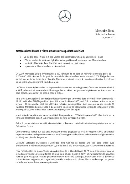 En 2020, Mercedes-Benz a immatriculé 52 600 véhicules neufs dans un marché automobile global de 1 650 000 véhicules neufs. La part de marché de Mercedes-Benz reste stable à 3.2%. Malgré la crise sanitaire et les incertitudes de la clientèle, Mercedes a réussi, pour la 4ème année consécutive, à conforter sa première place du marché haut de gamme.