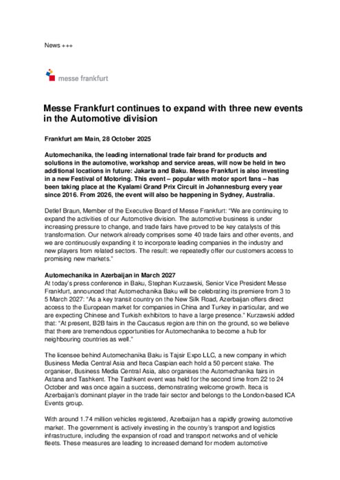 Automechanika, le salon international leader dans le domaine des produits et solutions pour l'automobile, les ateliers et les services, se tiendra désormais dans deux nouveaux lieux : Jakarta et Bakou. Messe Frankfurt investit également dans un nouveau Festival of Motoring. Cet événement, très apprécié des amateurs de sport automobile, se déroule chaque année depuis 2016 sur le circuit Kyalami Grand Prix à Johannesburg. À partir de 2026, il se tiendra également à Sydney, en Australie.