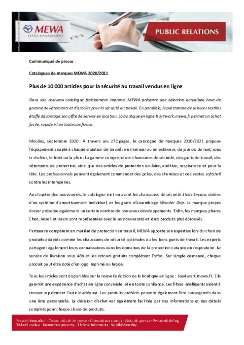 Dans son nouveau catalogue fraîchement imprimé, MEWA présente une sélection actualisée haut de gamme de vêtements et d'articles pour la sécurité au travail. En parallèle, le prestataire de services textiles étoffe davantage son offre de service en location. La boutique en ligne buy4work.mewa.fr permet un achat facile, rapide et en toute confiance.