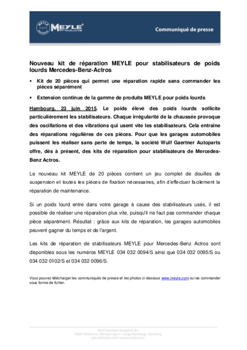 Chaque irrégularité de la chaussée provoque des oscillations et des vibrations qui usent vite les stabilisateurs des poids lourds. Cela entraîne des réparations régulières de ces pièces. Pour que les garages automobiles puissent les réparer sans perte de temps, la société Wulf Gaertner Autoparts offre des kits de réparation pour stabilisateurs de Mercedes-Benz Actros. Le nouveau kit MEYLE de 20 pièces contient un jeu complet de douilles de suspension et toutes les pièces de fixation.