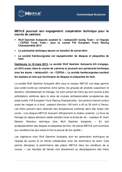 La société Wulf Gaertner Autoparts AG s'engage, en 2015 aussi, dans la course de camions et poursuit son partenariat technique avec les teams « tankpool24 » et « CEPSA ». La société hambourgeoise soutient les équipes en tant que fournisseur de disques et plaquettes de frein.