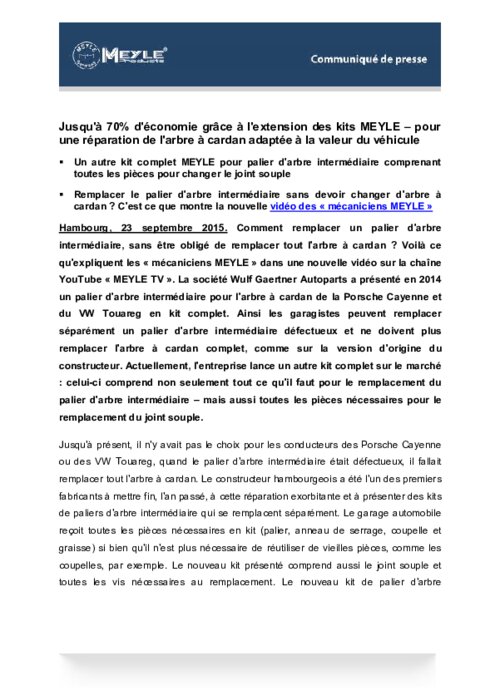 Comment remplacer un palier d'arbre intermédiaire, sans être obligé de remplacer tout l'arbre à cardan ? Voilà ce qu'expliquent les « mécaniciens MEYLE » dans une nouvelle vidéo sur la chaîne YouTube « MEYLE TV ». La société Wulf Gaertner Autoparts a présenté en 2014 un palier d'arbre intermédiaire pour l'arbre à cardan de la Porsche Cayenne et du VW Touareg en kit complet. Ainsi les garagistes peuvent remplacer séparément un palier d'arbre intermédiaire défectueux.