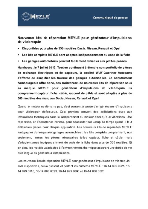 Tout en continuant à étendre son portfolio de pièces de rechange électriques et de capteurs, la société Wulf Gaertner Autoparts s'efforce de simplifier les travaux des garages automobiles. Le constructeur hambourgeois offre donc, dès maintenant, de nouveaux kits de réparation sous sa marque MEYLE pour générateur d'impulsions de vilebrequin. Ils comprennent capteur, fiche, câble, raccord de câble et sont adaptés à plus de 300 modèles des marques Dacia, Nissan, Renault et Opel.