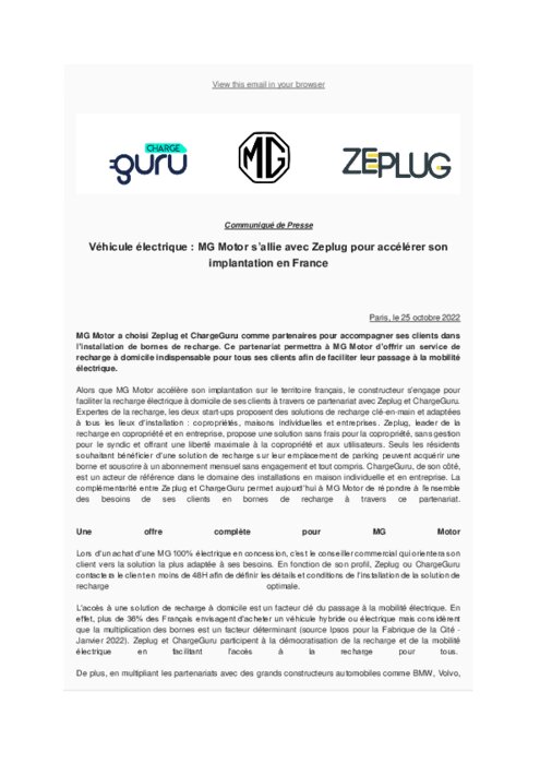 MG Motor a choisi Zeplug et ChargeGuru comme partenaires pour accompagner ses clients dans l’installation de bornes de recharge. Ce partenariat permettra à MG Motor d’offrir un service de recharge à domicile indispensable pour tous ses clients afin de faciliter leur passage à la mobilité électrique.