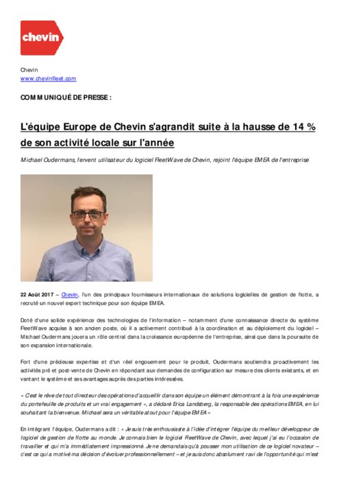 Chevin, l'un des principaux fournisseurs internationaux de solutions logicielles de gestion de flotte, a recruté un nouvel expert technique pour son équipe EMEA. Doté d'une solide expérience des technologies de l'information – notamment d'une connaissance directe du système FleetWave acquise à son ancien poste, où il a activement contribué à la coordination et au déploiement du logiciel – Michael Oudermans jouera un rôle central dans la croissance européenne de l'entreprise, ainsi que dans la