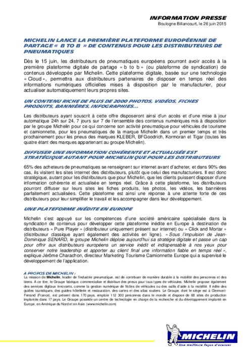 Dès le 15 juin, les distributeurs de pneumatiques européens pourront avoir accès à la première plateforme digitale de partage « b to b » (ou plateforme de syndication) de contenus développés par Michelin. Cette plateforme digitale, basée sur une technologie « Cloud », permettra aux distributeurs partenaires de disposer en temps réel des informations numériques officielles mises à disposition par le manufacturier, pour actualiser automatiquement leurs propres sites.