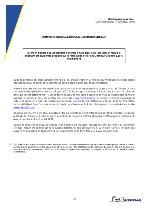 Dans le contexte de crise sanitaire mondiale, le groupe Michelin a mis en œuvre toutes les dispositions nécessaires pour la santé et la sécurité de ses employés ainsi que de leurs proches. Prenant acte des mesures de restrictions de circulation et de regroupement de personnes, le Groupe tiendra son Assemblée générale mixte, le 23 juin 2020 à 9h, exceptionnellement à huis clos et sans la présence physique de ses actionnaires...