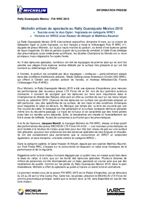 Le Rally Guanajuato Mexico 2015 s’est achevé aujourd’hui, dimanche 8 mars, sur la victoire de Sébastien Ogier et Julien Ingrassia. Le duo français a hissé la Volkswagen Polo R WRC n°1, équipée de pneus Michelin, sur la plus haute marche du podium, au terme d’une épreuve gérée de façon magistrale. En tête du peloton à partir de la journée de vendredi, à l’aide d’une stratégie des pneumatiques aussi audacieuse qu’efficace, les doubles Champions du Monde ont vu leurs principaux rivaux disparaître.