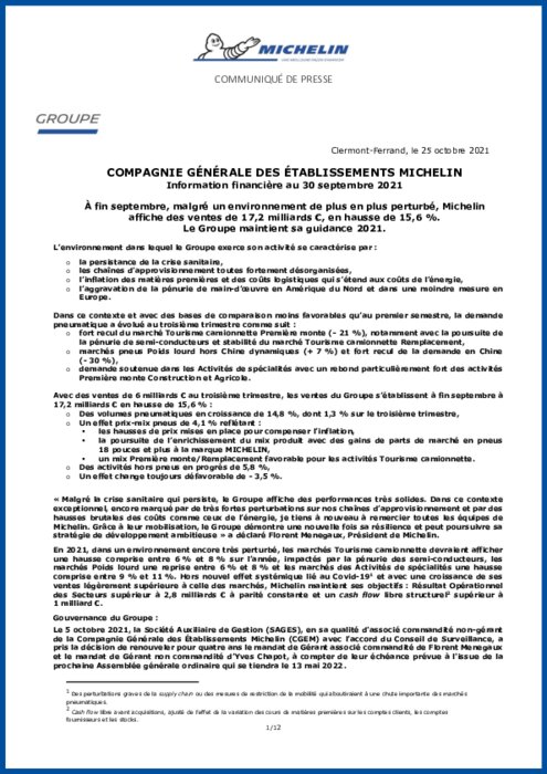 Le troisième trimestre a été marqué par "la persistance de la crise sanitaire, les chaînes d'approvisionnement toutes fortement désorganisées, l'inflation des matières premières et des coûts logistiques qui s'étend aux coûts de l'énergie, l'aggravation de la pénurie de main-d'oeuvre en Amérique du Nord et dans une moindre mesure en Europe", détaille Michelin dans un communiqué.