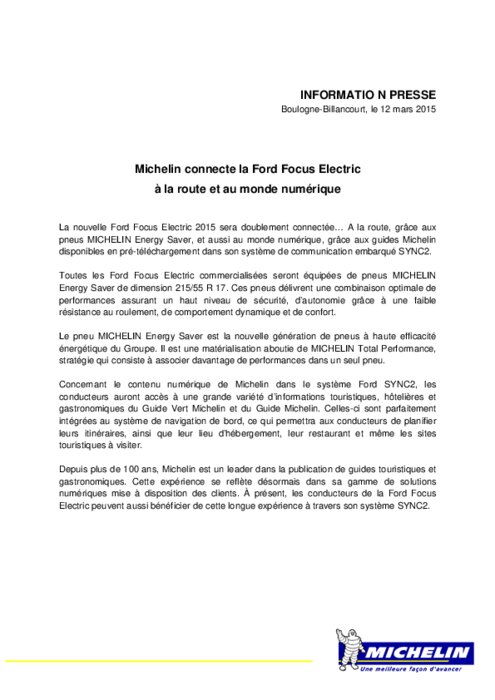 La nouvelle Ford Focus Electric 2015 sera doublement connectée… A la route, grâce aux pneus MICHELIN Energy Saver, et aussi au monde numérique, grâce aux guides Michelin disponibles en pré-téléchargement dans son système de communication embarqué SYNC2.