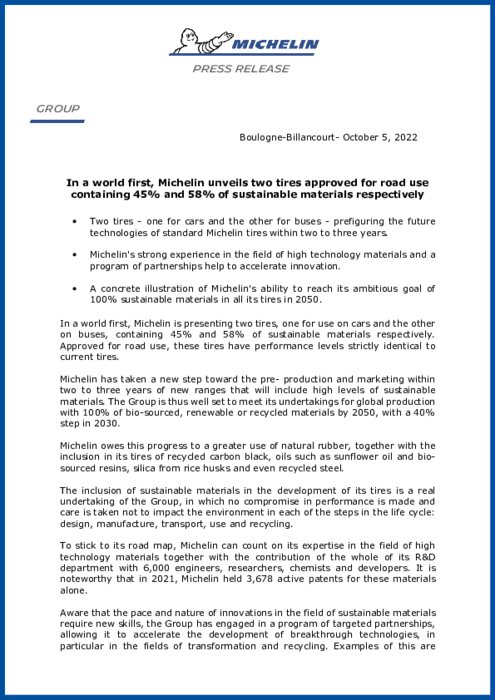 En première mondiale, Michelin présente deux pneus, l'un pour les voitures et l'autre pour les bus, contenant respectivement 45 % et 58 % de matériaux durables. Homologués pour un usage routier, ces pneus ont des performances strictement identiques à celles des pneus actuels.