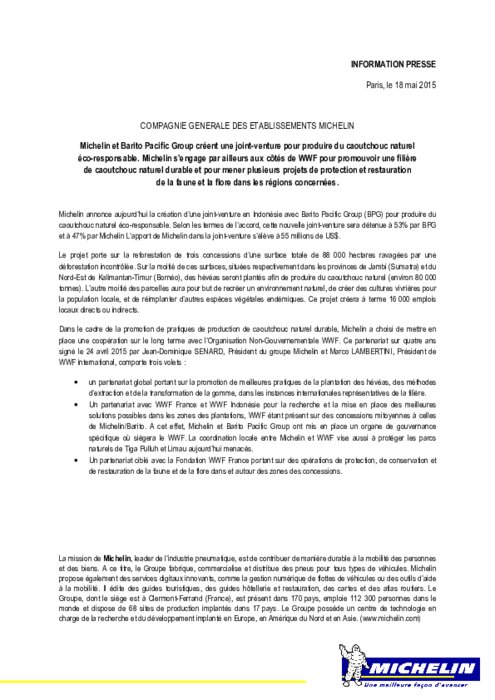 Michelin et Barito Pacific Group créent une joint-venture pour produire du caoutchouc naturel éco-responsable. Michelin s’engage par ailleurs aux côtés de WWF pour promouvoir une filière de caoutchouc naturel durable et pour mener plusieurs projets de protection et restauration de la faune et la flore dans les régions concernées. Selon les termes de l’accord, cette nouvelle joint-venture sera détenue à 53% par BPG et à 47% par Michelin.