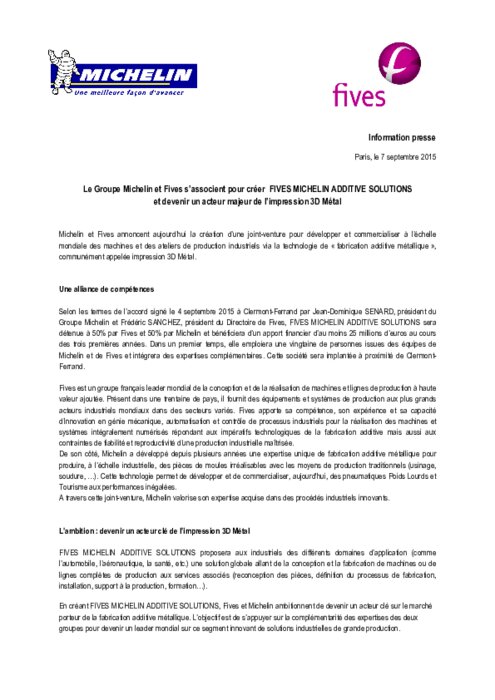 Michelin et Fives annoncent la création d’une joint-venture pour développer et commercialiser à l’échelle mondiale des machines et des ateliers de production industriels via la technologie de « fabrication additive métallique », communément appelée impression 3D Métal.