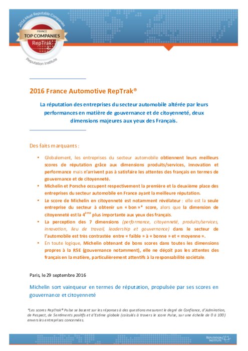 Globalement, les entreprises du secteur automobile obtiennent leurs meilleurs scores de réputation grâce aux dimensions produits/services, innovation et performance mais n’arrivent pas à satisfaire les attentes des français en termes de gouvernance et de citoyenneté. Michelin et Porsche occupent respectivement la première et la deuxième place des entreprises du secteur automobile en France ayant la meilleure réputation.