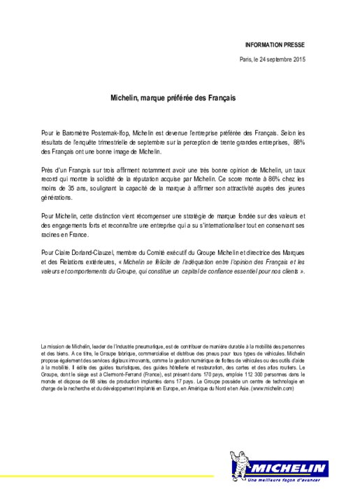 Equipementiers 24 septembre 2015 - 18:40 Pour le Baromètre Posternak-Ifop, Michelin est devenue l’entreprise préférée des Français. Selon les résultats de l’enquête trimestrielle de septembre sur la perception de trente grandes entreprises, 88% des Français ont une bonne image de Michelin. PDF (188 Ko) Télécharger