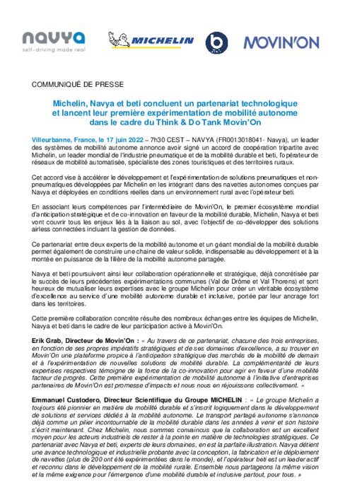 NAVYA, un leader des systèmes de mobilité autonome annonce avoir signé un accord de coopération tripartite avec Michelin, un leader mondial de l'industrie pneumatique et de la mobilité durable et beti, l’opérateur de réseaux de mobilité automatisée, spécialiste des zones touristiques et des territoires ruraux.