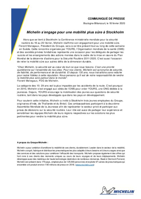 Alors que se tient à Stockholm la Conférence ministérielle mondiale pour la sécurité routière du 19 au 20 février, Michelin réaffirme son engagement pour une mobilité sûre. Florent Menegaux, Président du Groupe, sera à ce titre présent tout au long de cette semaine en Suède. Cette rencontre organisée par YOURS, l’Organisation mondiale de la santé (OMS) et des sociétés privées fondatrices représente une occasion pour les délégués de partager les succès et les enseignements des actions menées...