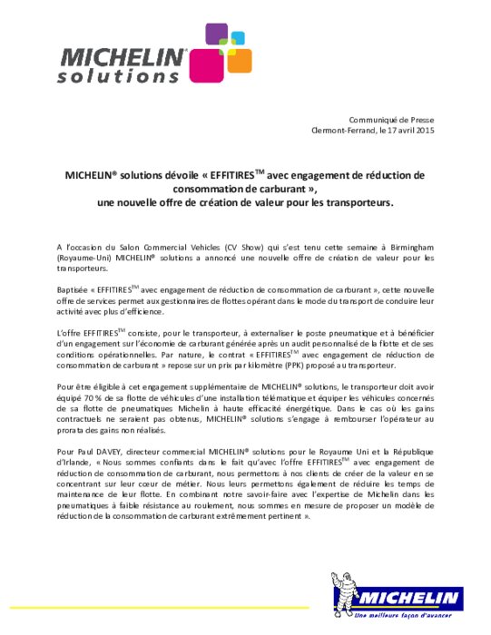 A l’occasion du Salon Commercial Vehicles (CV Show) qui s’est tenu cette semaine à Birmingham (Royaume-Uni) MICHELIN solutions a annoncé une nouvelle offre de création de valeur pour les transporteurs Baptisée « EFFITIRES avec engagement de réduction de consommation de carburant », cette nouvelle offre de services permet aux gestionnaires de flottes opérant dans le mode du transport de conduire leur activité avec plus d’efficience.