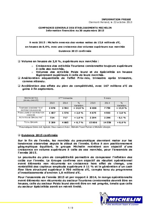 Sur la fin de l’année, les marchés du pneumatique devraient rester sur les tendances observées depuis le début de l’année. Grâce à son positionnement géographique équilibré, le groupe Michelin maintient son objectif d’une croissance en volume supérieure à celle de ses marchés, pour l’ensemble de l’année 2015.