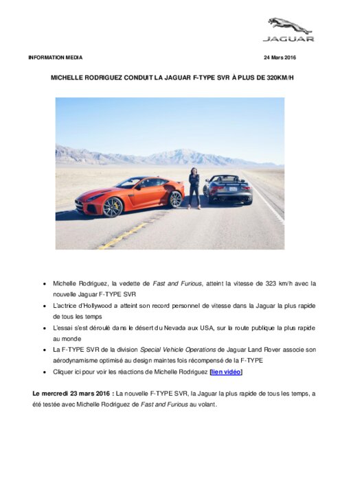La nouvelle F-TYPE SVR, la Jaguar la plus rapide de tous les temps, a été testée avec Michelle Rodriguez de Fast and Furious au volant. Sur une route fermée du désert du Nevada où a lieu le Silver State Classic Challenge, l’actrice a poussé la voiture jusqu’à 323 km/h au compteur, un record personnel pour Michelle.
