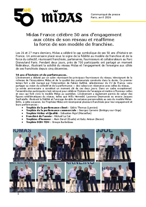 Les 26 et 27 mars derniers, Midas a célébré le cap symbolique de ses 50 ans d’histoire en France. Un anniversaire placé sous le signe de la fidélité au modèle de franchise et de la force du collectif, réunissant franchisés, partenaires, fournisseurs et collaborateurs au Parc Disneyland Paris. Pendant deux jours, près de 700 participants ont partagé un moment fédérateur, illustrant la solidité du réseau Midas et l’engagement de l’enseigne aux côtés de ses franchisés depuis cinq décennies.