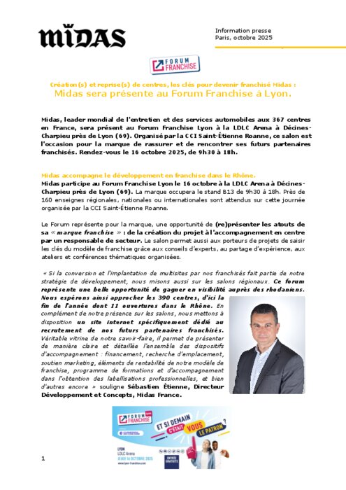 Midas, leader mondial de l’entretien et des services automobiles aux 367 centres en France, sera présent au Forum Franchise Lyon à la LDLC Arena à Décines-Charpieu près de Lyon (69). Organisé par la CCI Saint-Étienne Roanne, ce salon est l’occasion pour la marque de rassurer et de rencontrer ses futurs partenaires franchisés. Rendez-vous le 16 octobre 2025, de 9h30 à 18h.
