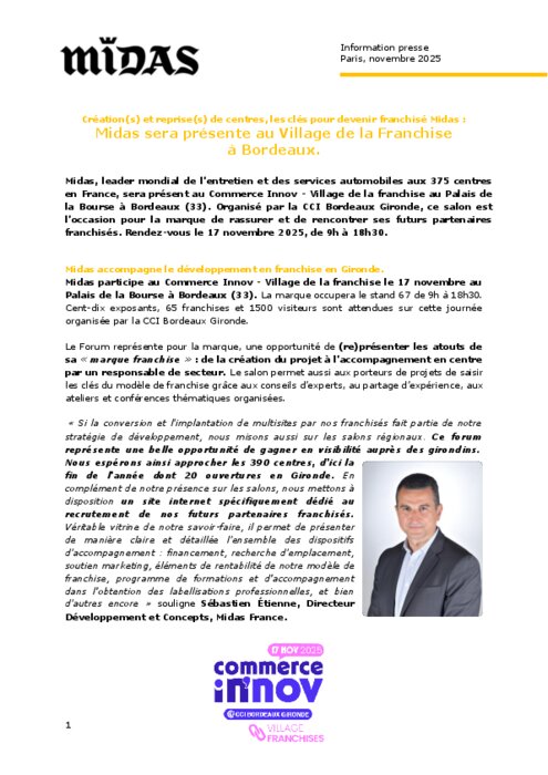 Midas, leader mondial de l’entretien et des services automobiles aux 375 centres en France, sera présent au Commerce Innov - Village de la franchise au Palais de la Bourse à Bordeaux (33). Organisé par la CCI Bordeaux Gironde, ce salon est l’occasion pour la marque de rassurer et de rencontrer ses futurs partenaires franchisés. Rendez-vous le 17 novembre 2025, de 9h à 18h30.