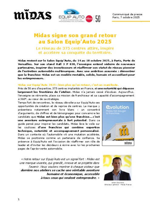 Midas revient sur le Salon Equip’Auto, du 14 au 18 octobre, à Paris, Porte de Versailles. Sur son stand Hall 3 P 038, l’enseigne entend séduire de nouveaux partenaires, inspirer des investisseurs et réaffirmer son statut de réseau pionnier de l’entretien automobile multimarques. Avec une ambition assumée : démontrer que la franchise Midas est un modèle rentable, solide, humain et accueillant pour les entrepreneurs.