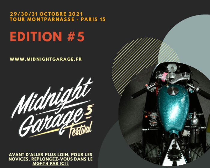 Déjà 2 ans depuis la dernière édition du Midnight Festival Garage. C'est l'année des retrouvailles, du partage des valeurs communes du ride, de l'héritage et de la découverte ! Comme chaque fois, on va plus loin qu'un simple festival, vous êtes ici chez vous ! On a poussé les murs et déniché les perles de la food, des artistes, des motos aux autos d'exception dans ce lieu de 3000m2 au pied de la Tour Montparnasse
