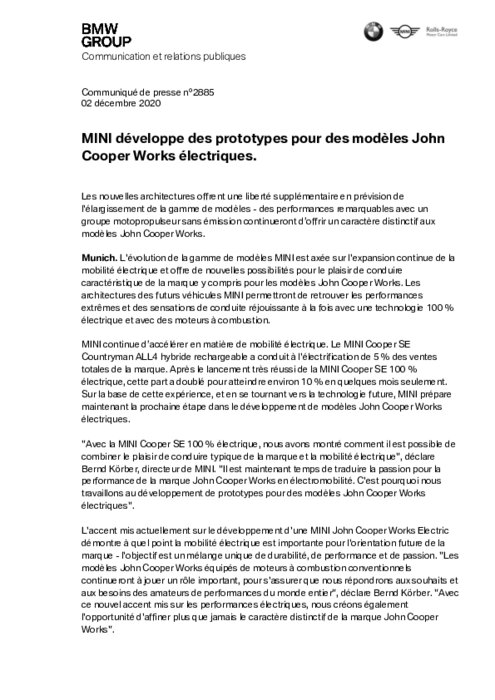 L'évolution de la gamme de modèles MINI est axée sur l'expansion continue de la mobilité électrique et offre de nouvelles possibilités pour le plaisir de conduire caractéristique de la marque y compris pour les modèles John Cooper Works. Les architectures des futurs véhicules MINI permettront de retrouver les performances extrêmes et des sensations de conduite réjouissante à la fois avec une technologie 100 % électrique et avec des moteurs à combustion.