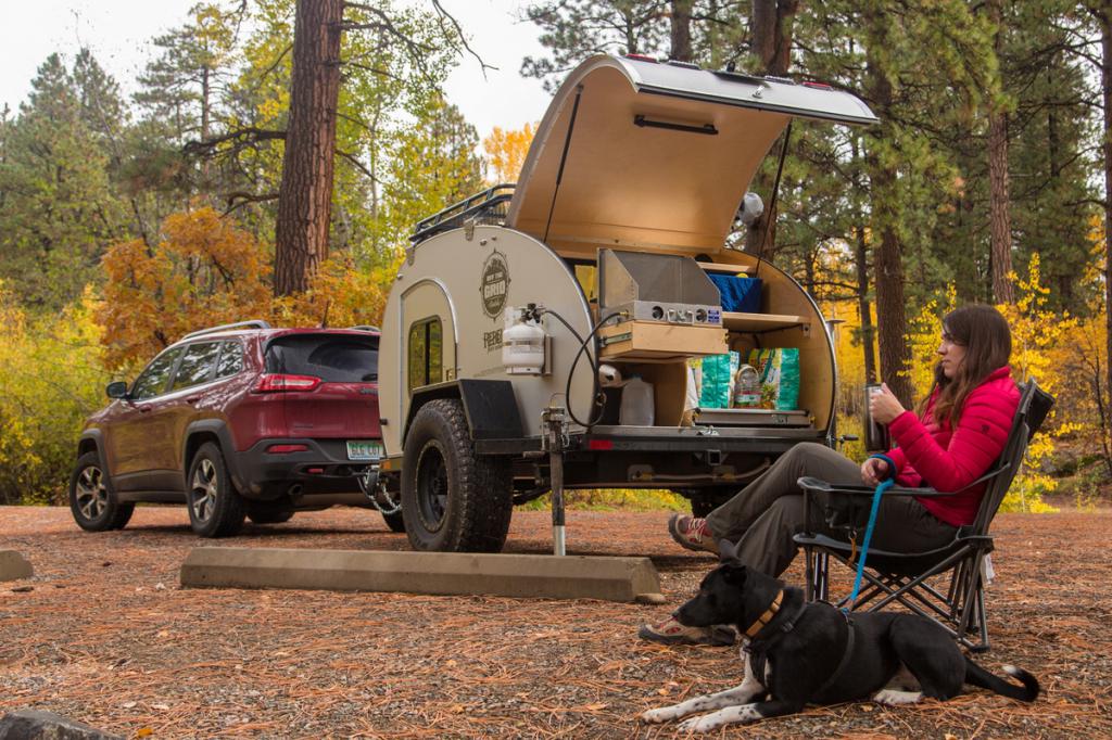 Un lit deux places occupe tout l'habitacle. On n'y tient pas debout, mais le nid semble douillet. Une petite porte de chaque côté y donne accès. A l'extérieur, un panneau coulisse pour dévoiler un évier et un réchaud. Sur le côté, une prise d'eau pour la douche.