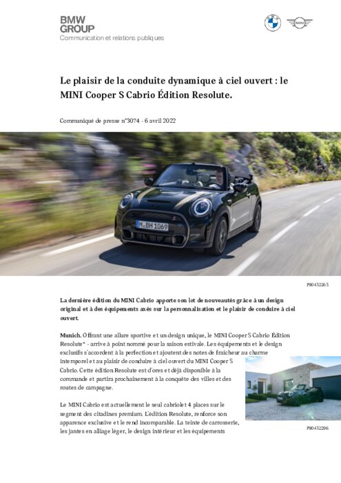 Offrant une allure sportive et un design unique, le MINI Cooper S Cabrio Édition Resolute - arrive à point nommé pour la saison estivale. Les équipements et le design exclusifs s'accordent à la perfection et ajoutent des notes de fraîcheur au charme intemporel et au plaisir de conduire à ciel ouvert du MINI Cooper S Cabrio. Cette édition Resolute est d'ores et déjà disponible à la commande et partira prochainement à la conquête des villes et des routes de campagne.